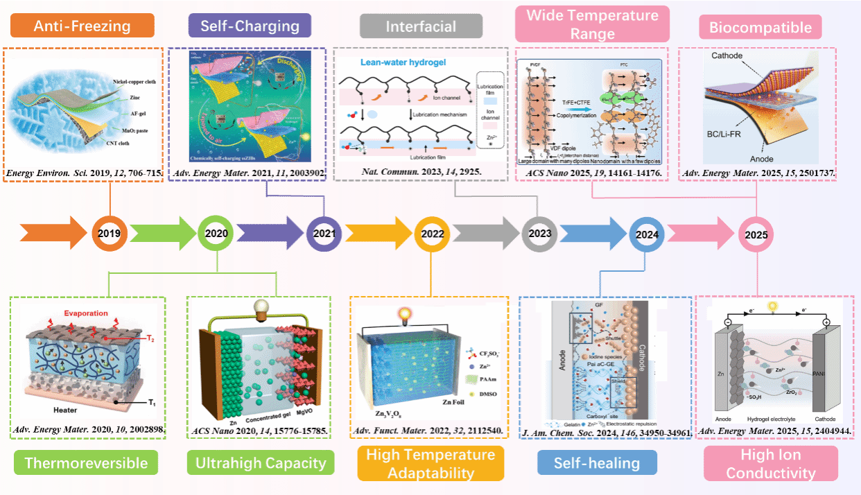 在团队前期研究基础上,本综述依托课题组在水系锌离子电池领域的长期积累,针对便携式电子设备、电网级储能及电动汽车发展对高性能二次电池的迫切需求,系统梳理了凝胶电解质的分类体系,重点阐述了水凝胶和凝胶聚合物电解质的分子交联结构与电化学性能之间的内在关联,深入探讨了凝胶电解质在宽温域适应性、热可逆性、自修复能力及高离子电导率等多元应用场景中的关键作用,还前瞻性地引入了机器学习在凝胶电解质加速筛选与优化设计中的新兴应用,阐明了开发宽温域、高安全、自修复且具有高离子电导率的凝胶电解质的设计途径,为下一代凝胶电解质的设计与发展提供了理论指导。