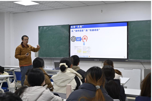 为洞悉学科前沿,激发创新思维,2025年11月27日,在我班班主任张鹏飞老师的精心组织下,校青年英才张超老师为明德班全体同学带来了一场深度讲座,聚焦于人工智能在化学领域的应用。
